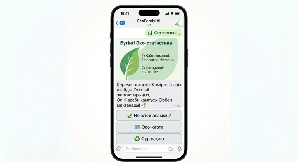 Сонымен қатар EcoFarabi AI пайдаланушыларды сенбіліктерге, ағаш отырғызу акцияларына, жасыл аймақтарды дамытуға және қоршаған ортаны қорғауға арналған басқа іс-шараларға белсенді қатысуға шақырады. Платформа чат-бот форматында Telegram қосымшасы арқылы қолжетімді, бұл экологиялық ақпаратты және кеңестерді тез әрі ыңғайлы түрде алуға мүмкіндік береді.
